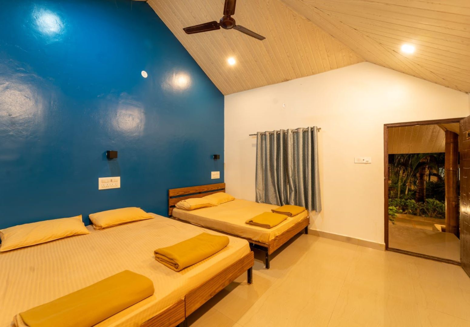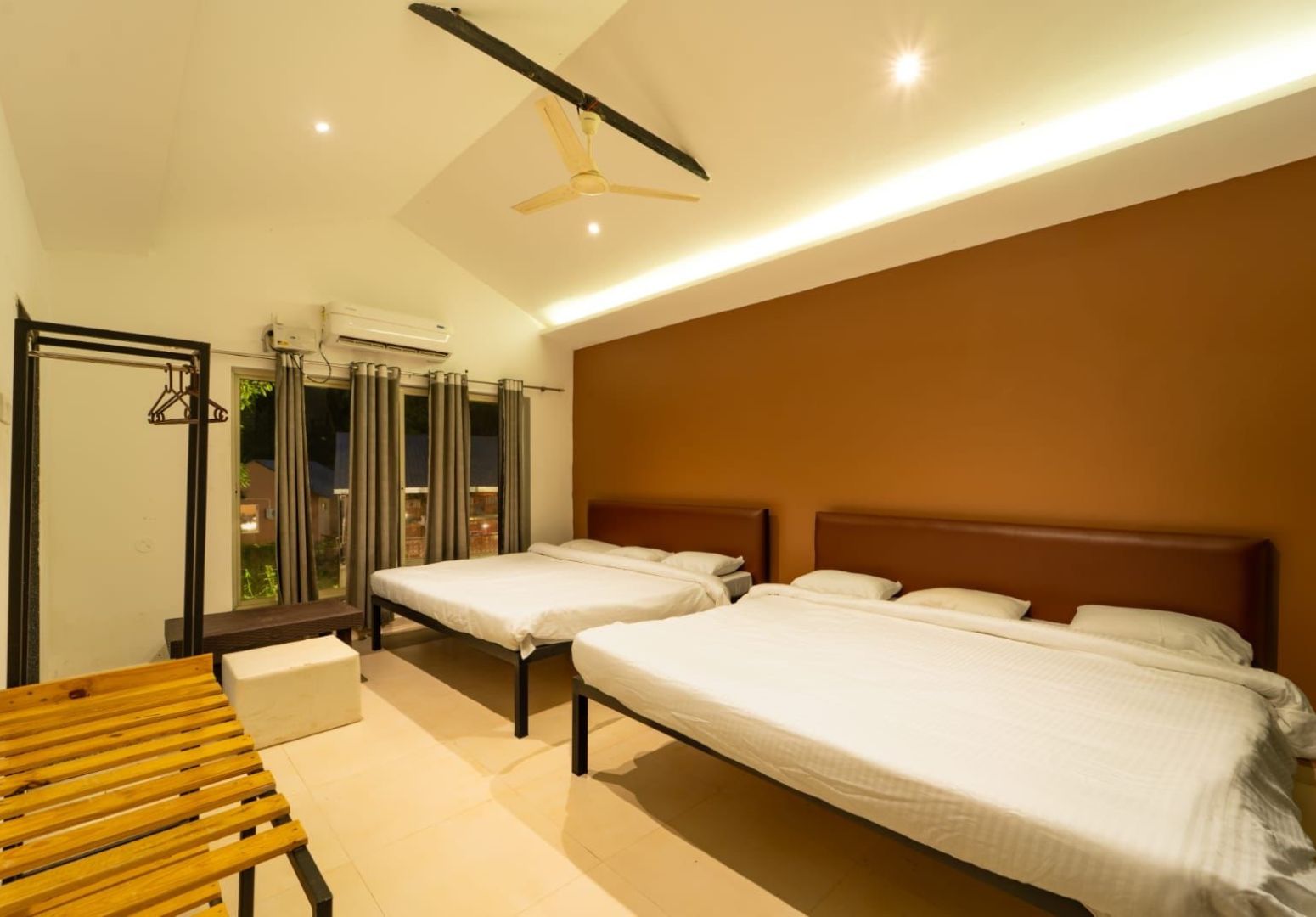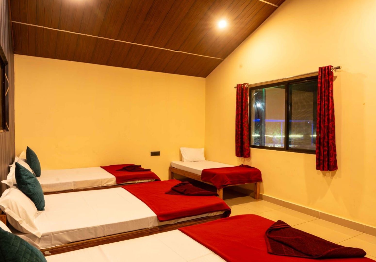 The Deluxe Room package at Dandeli Ideals includes a comfortable stay with attached bathroom, air-conditioning, hot water, high-speed WiFi, room service, free parking, swimming pool access, and complimentary breakfast, making it a complete stay experience among Dandeli resorts.
