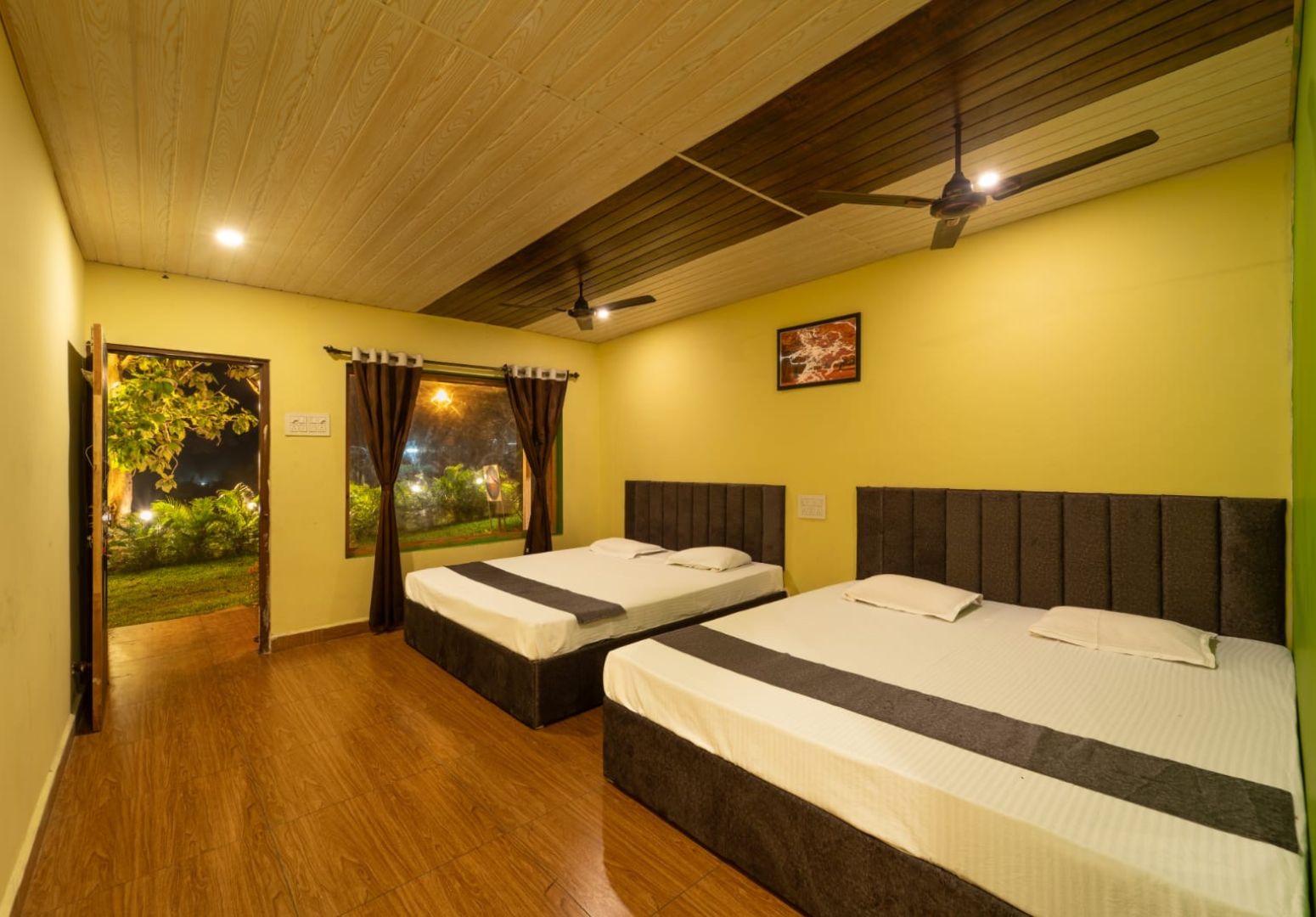 The Deluxe Room package at Dandeli Ideals includes a comfortable stay with attached bathroom, air-conditioning, hot water, high-speed WiFi, room service, free parking, swimming pool access, and complimentary breakfast, making it a complete stay experience among Dandeli resorts.